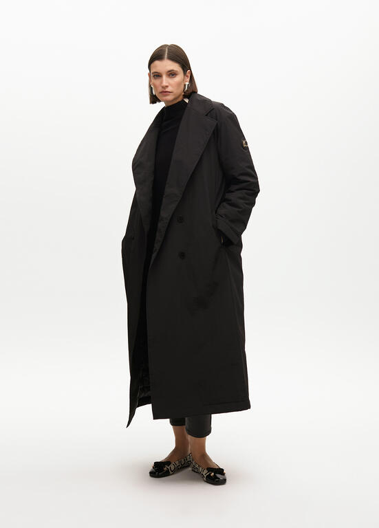 Deze lange zwarte jas is ontworpen met een ruime kap en heeft een afneembare, gewatteerde binnenlaag die je warm houdt op koude dagen.