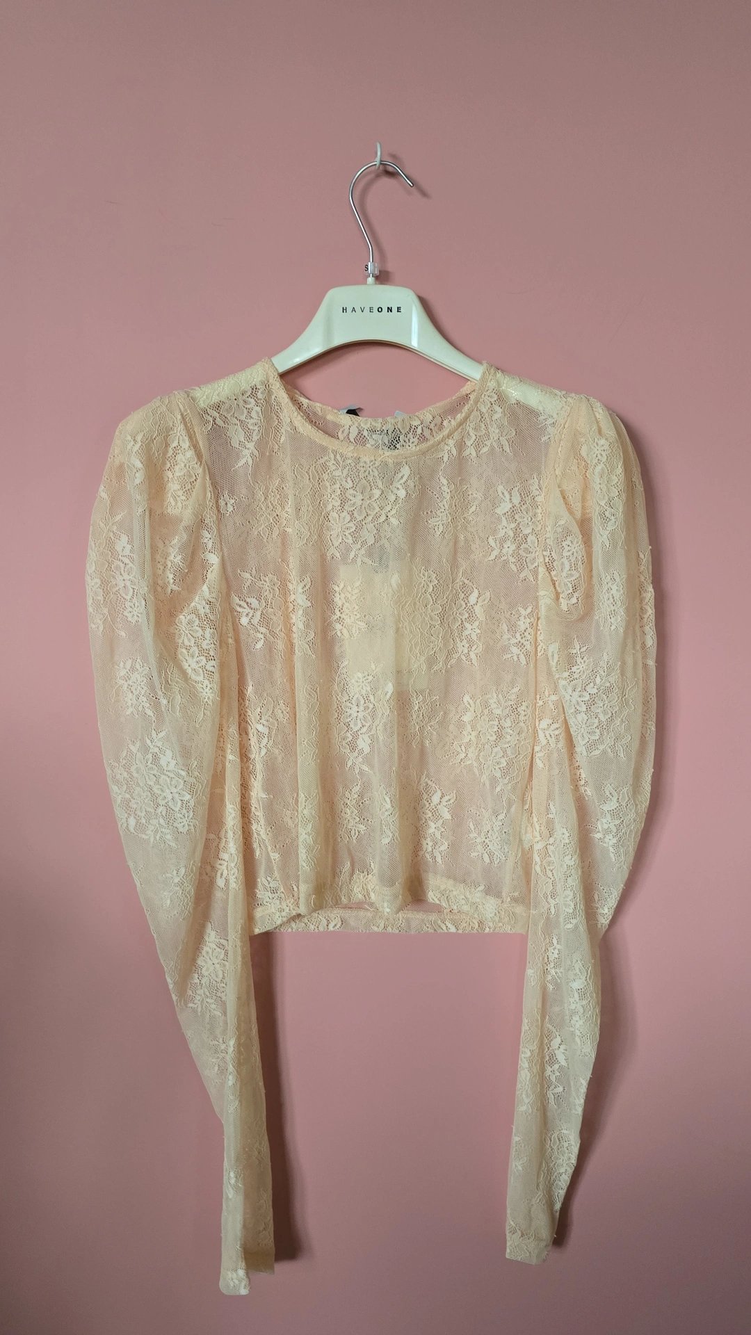 Voeg een vleugje verfijning toe aan je look met onze Elegante Kanten Top. Deze prachtige top is vervaardigd uit delicate, doorschijnende kant met een romantisch bloemenpatroon. De lange, luchtige mouwen en de ronde halslijn zorgen voor een vrouwelijke uitstraling, terwijl de cropped lengte perfect is om te combineren met hoge taille jeans of rokken.